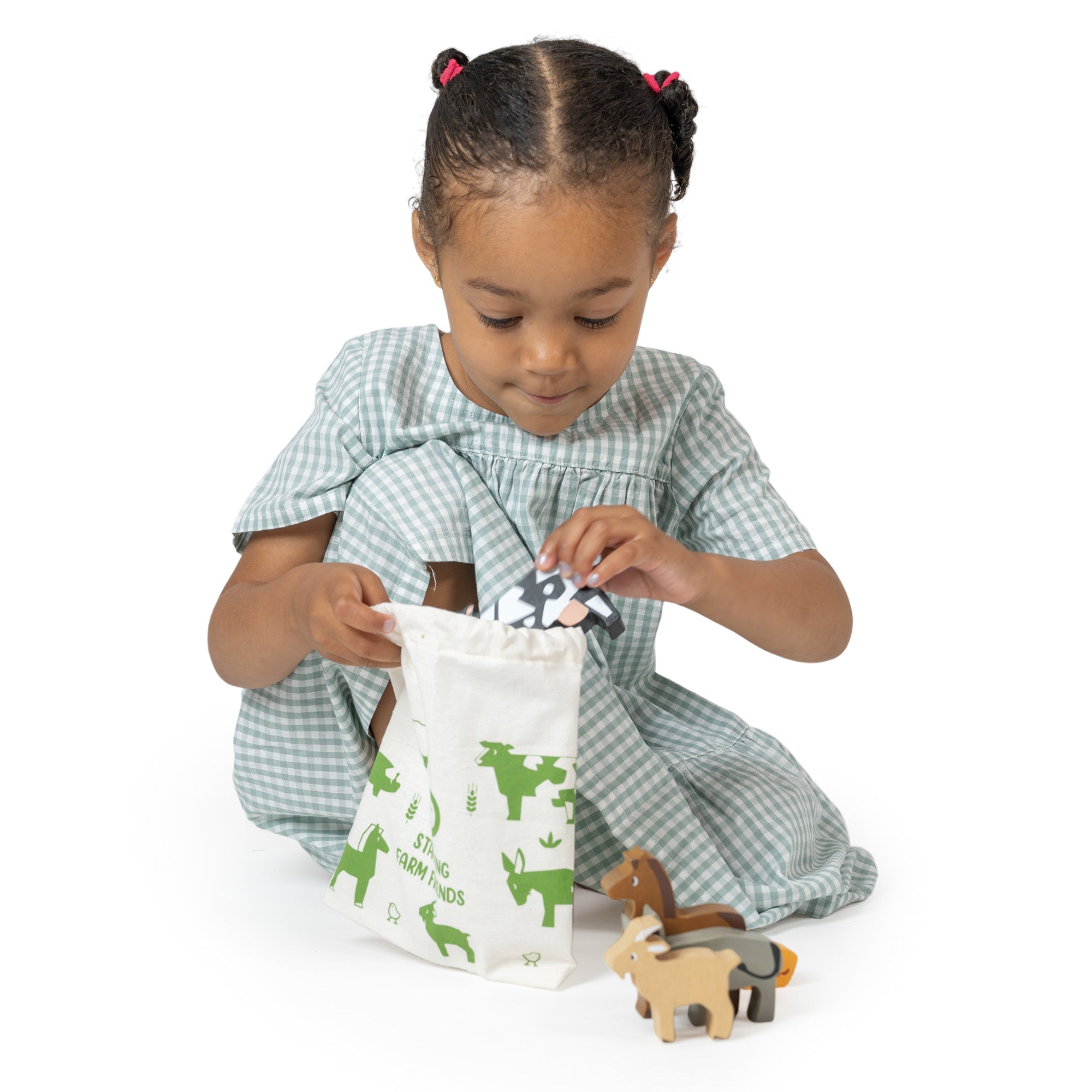 7 delightfully illustrated farm animals crafted from solid rubber wood and painted in earthy natural colours. Practice balancing skills and stack the animals as high as possible. Pack the farmyard friends away after play in a pretty drawstring bag.