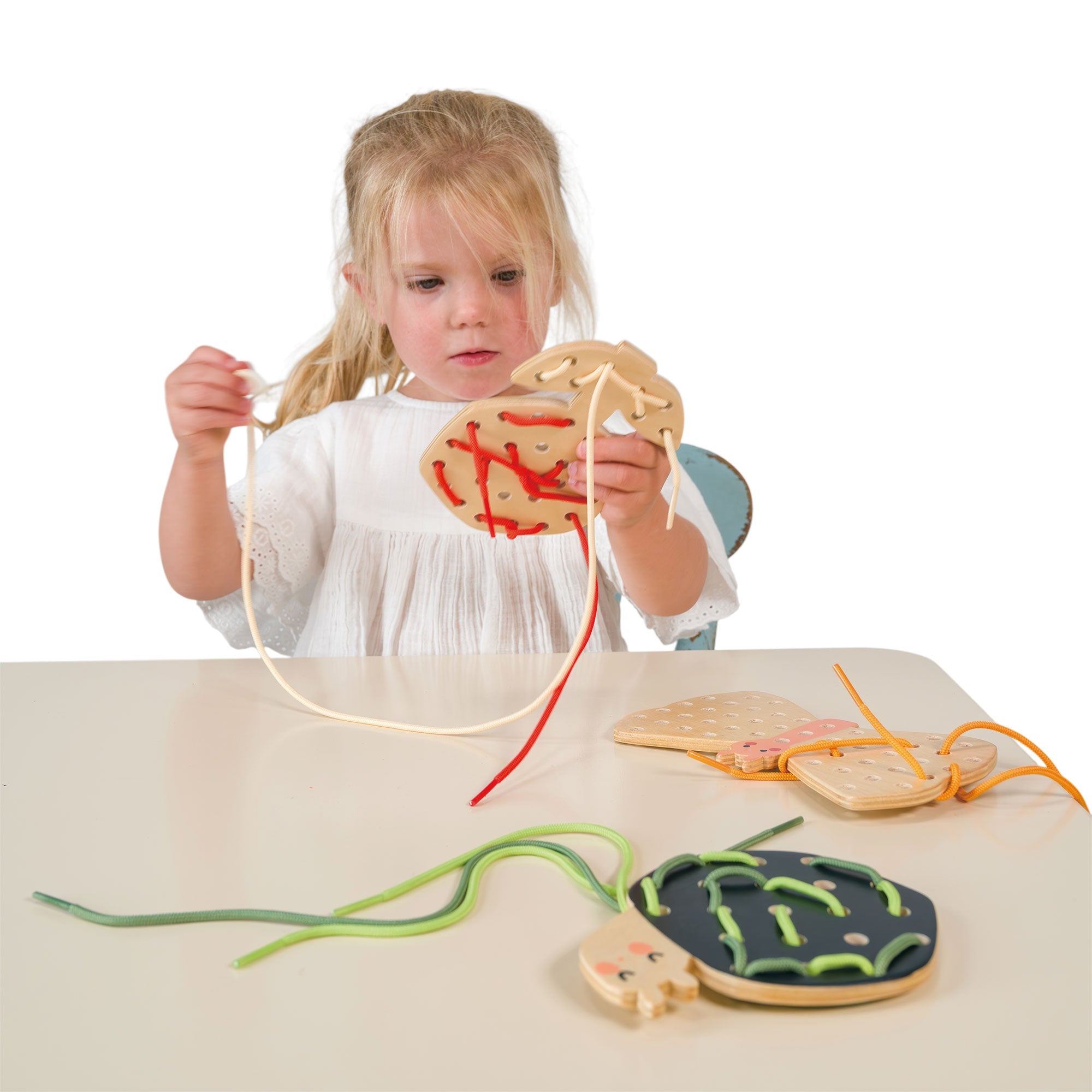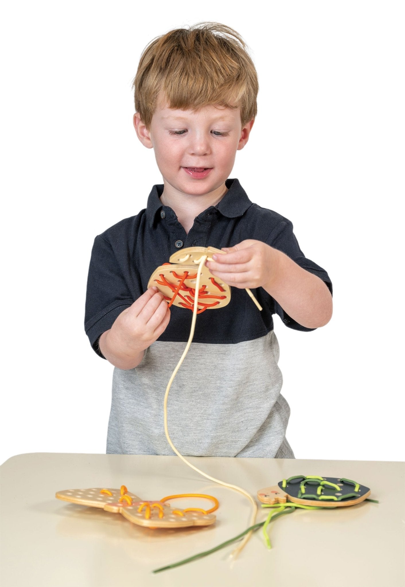 Create endless combinations of colored cord lines on these 3 charming garden-themed lacing boards – a butterfly, a flower, and a snail.