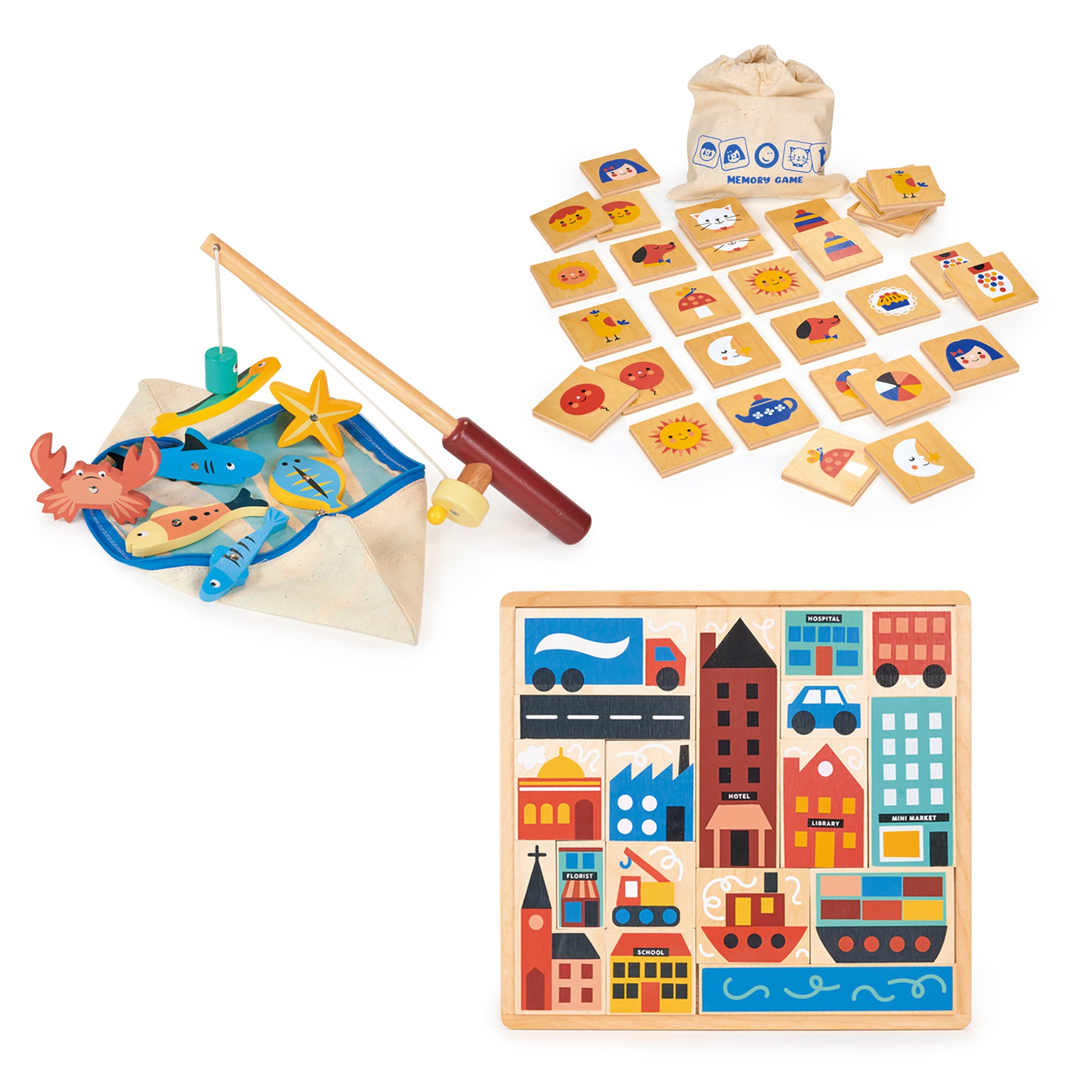 Delight your child with the 'Games Bundle,' a trio of engaging and educational games designed to entertain while teaching valuable skills. First in the set is the 'Fishing Game,' which will hook your little one's attention. It features a magnetic fishing rod that 'catches' seven charming sea creatures, each eagerly waiting to be fished from imaginary waters. The game is neatly packed in a pencil-case bag with a blue wave interior, perfect for on-the-go play. Next, test your child's recall with the 'Memory Game'. It includes 32 pieces adorned with beautifully illustrated, easy-to-recognize objects like a cheerful sun, a crescent moon, a playful dog, and a colorful balloon. This memory-boosting game is housed in an illustrated drawstring bag for easy storage. Lastly, the 'Town Puzzle' invites children to a hands-on exploration of community life. With 17 removable pieces that fit into a vibrant town scene, it's a wonderful way for kids to enhance their matching skills and learn about different town elements. This 'Games Bundle' is an exceptional set for fostering fine motor development, memory, and cognitive skills, all through the joy of play.