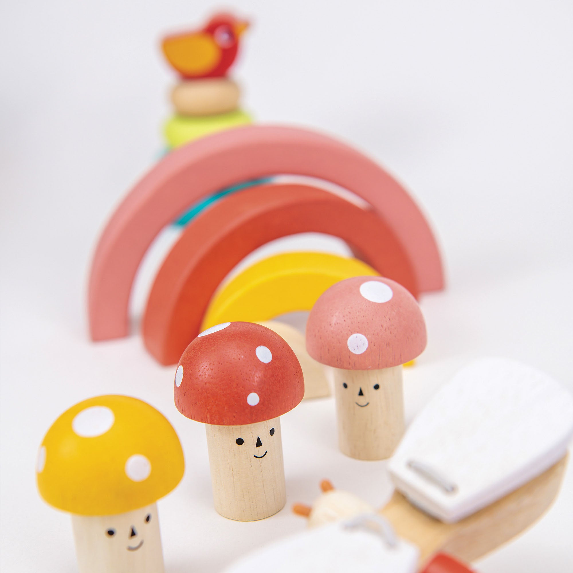 This wooden tea set toy includes a dotty tray, a toy teapot, 2 pretend cups saucers and spoons, a pretend sugar pot with lid, a pretend milk jug and 2 wood biscuits.